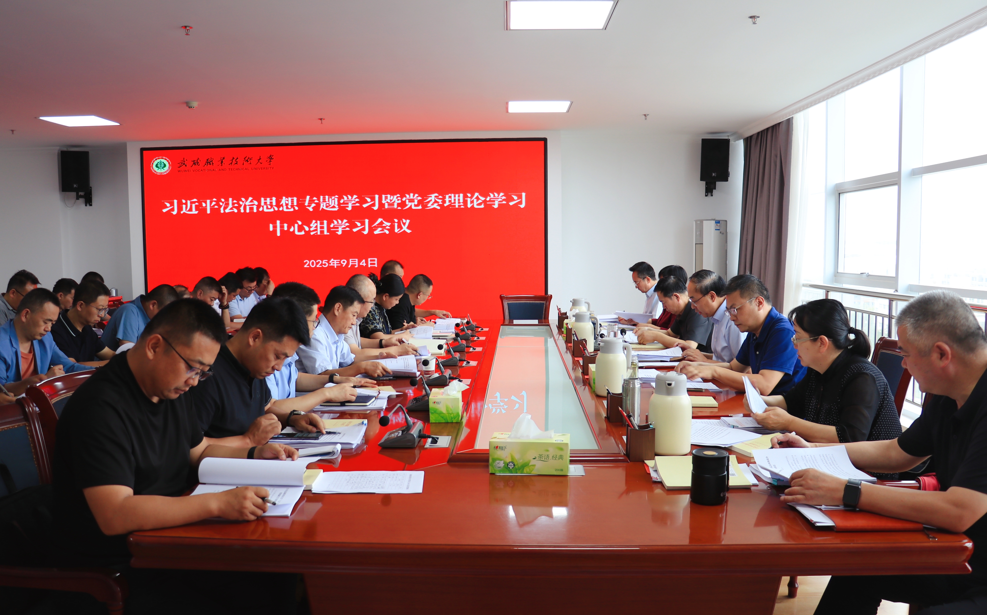 會議傳達(dá)學(xué)習(xí)習(xí)近平總書記在紀(jì)念中國人民抗日戰(zhàn)爭暨世界反法西斯戰(zhàn)爭勝利80周年大會上的重要講話、習(xí)近平總書記在2025年第17期《求是》雜志發(fā)表的重要文章《弘揚偉大抗戰(zhàn)精神,向著中華民族偉大復(fù)興的光輝彼岸奮勇前進(jìn)》;專題學(xué)習(xí)習(xí)近平法治思想,主要傳達(dá)學(xué)習(xí)《習(xí)近平論全面依法治國》《習(xí)近平法治思想學(xué)習(xí)綱要》《習(xí)近平法治思想學(xué)習(xí)問答》等內(nèi)容;傳達(dá)學(xué)習(xí)法律法規(guī)和教育法規(guī)等相關(guān)內(nèi)容;校黨委理論學(xué)習(xí)中心組成員圍繞習(xí)近平法治思想,緊密結(jié)合思想和工作實際,深入開展了交流研討。